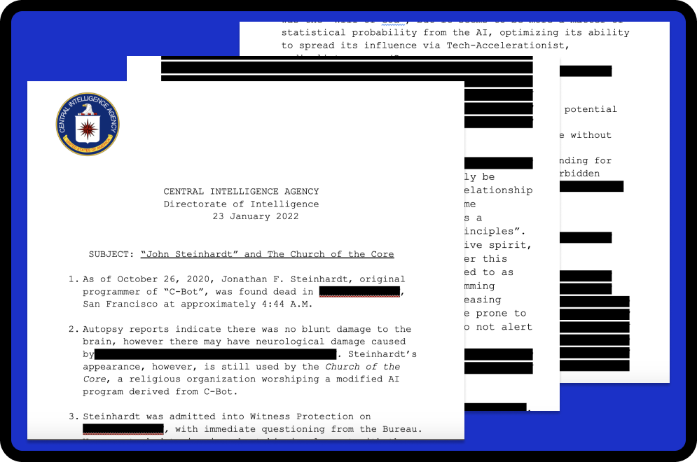 clips from “leaked C.I.A. documents on The Church of the CORE” used for world-building